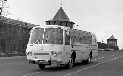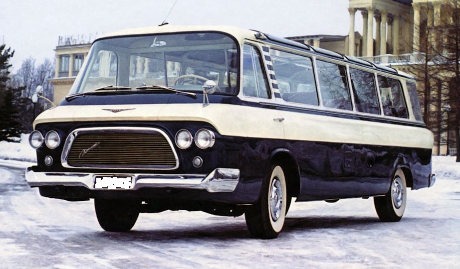 Советский автобус, отличался футуристическими гнутыми боковыми стёклами и задней дверью в стиле бортового люка авиалайнера. Рассчитанный на 24 человек, междугородний автобус ПАЗ оснащался расположенным сзади 150-сильным мотором ЗИЛ-130 и разгонялся до 110 км/ч.